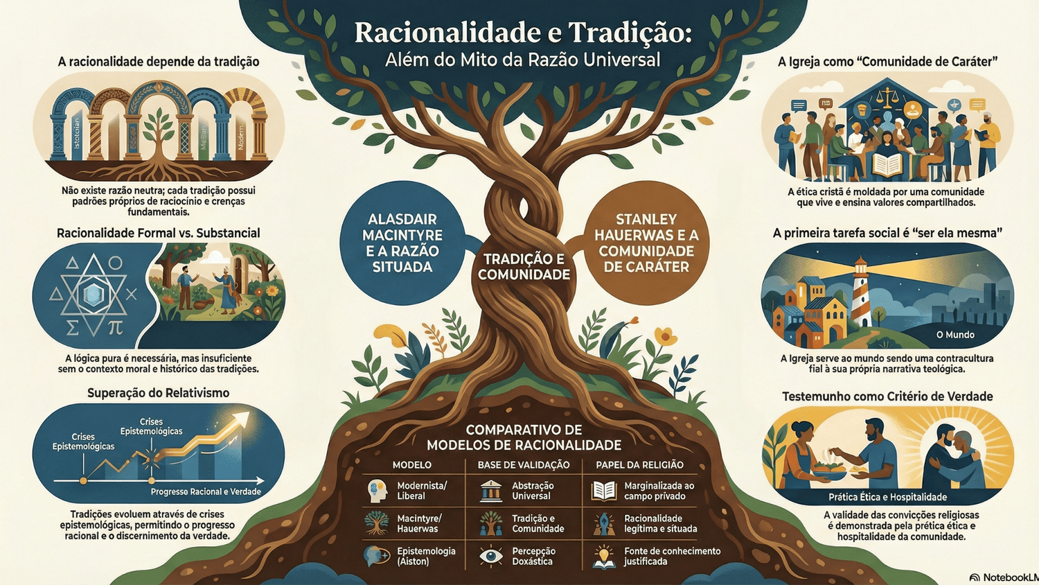 MacIntyre propõe que a racionalidade emerge de contextos sociais específicos, enquanto Hauerwas aplica essa lógica à comunidade cristã, apresentando a Igreja como uma contracultura ética dotada de narrativa própria. Complementarmente, o artigo utiliza as ideias de William Alston para oferecer uma justificação epistêmica às percepções místicas, equiparando a experiência religiosa a outras formas de conhecimento sensorial. Em suma, o material argumenta que a fé não pertence ao campo do irracional, mas constitui uma forma de saber fundamentado na prática e na identidade coletiva.